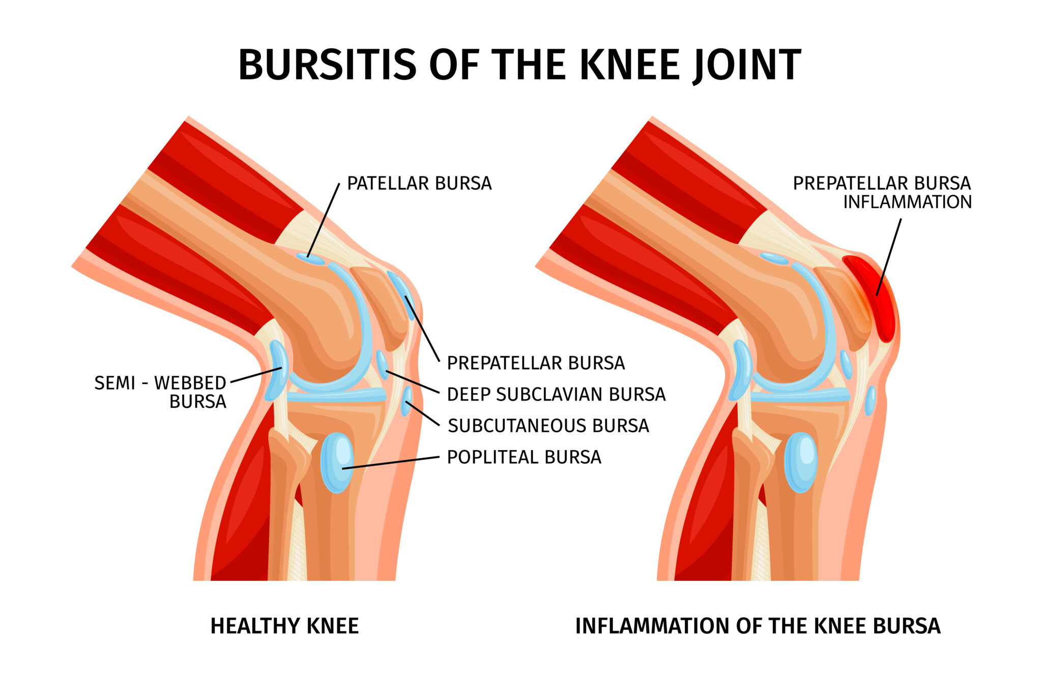 Бурсит коленного сустава — воспаление одной или нескольких синовиальных сумок (бурса), сопровождающееся скоплением экссудата, болью и ограничением движений. Наиболее часто поражаются преднадколенниковая (prepatellaris), поднадколенниковая (infrapatellaris) и ансериновая (гусиной лапки) бурсы. Бурсит может быть асептическим, возникающим при хронических микротравмах и перегрузках, либо инфекционным при проникновении бактерий. Патология характерна для спортсменов и лиц с повышенной механической нагрузкой на коленный сустав.