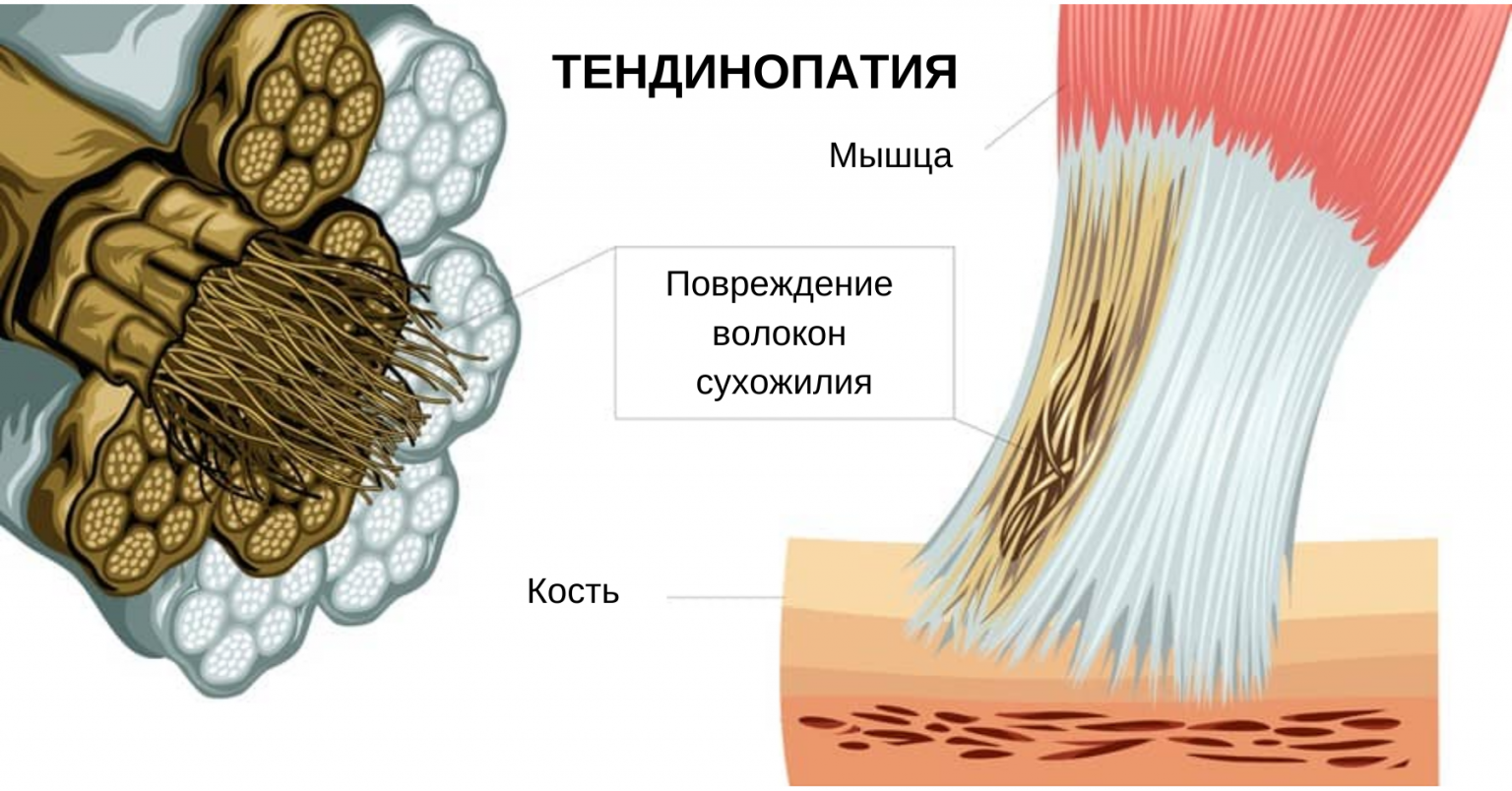 Механически повторяющиеся движения приводят к микроразрывам и фиброзным изменениям, снижению эластичности сухожилия, болевому синдрому и ограничению функции разгибания.