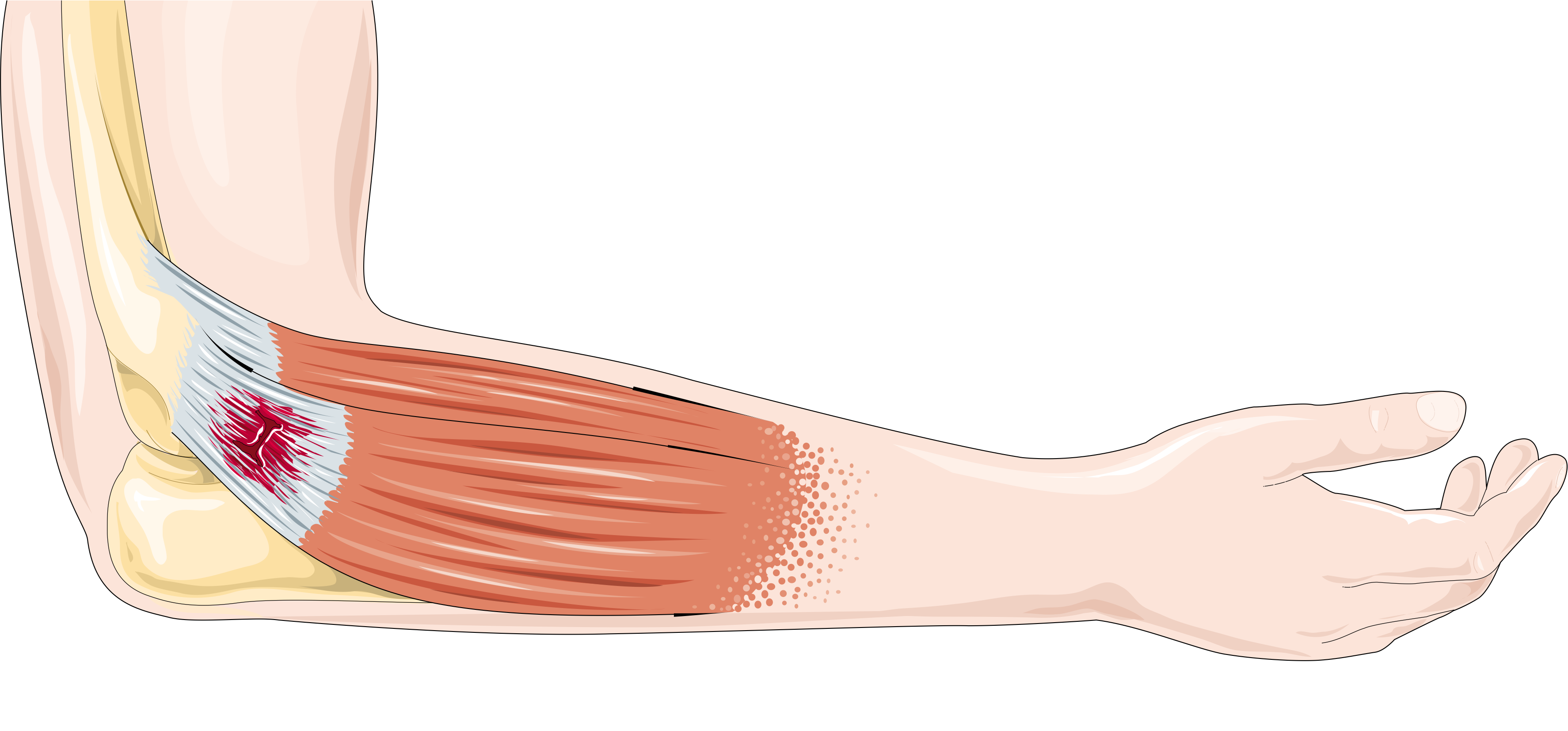 При латеральном эпикондилите чаще поражаются разгибатели запястья (extensor carpi radialis brevis), при медиальном — сгибатели (flexor carpi radialis/ulnaris).