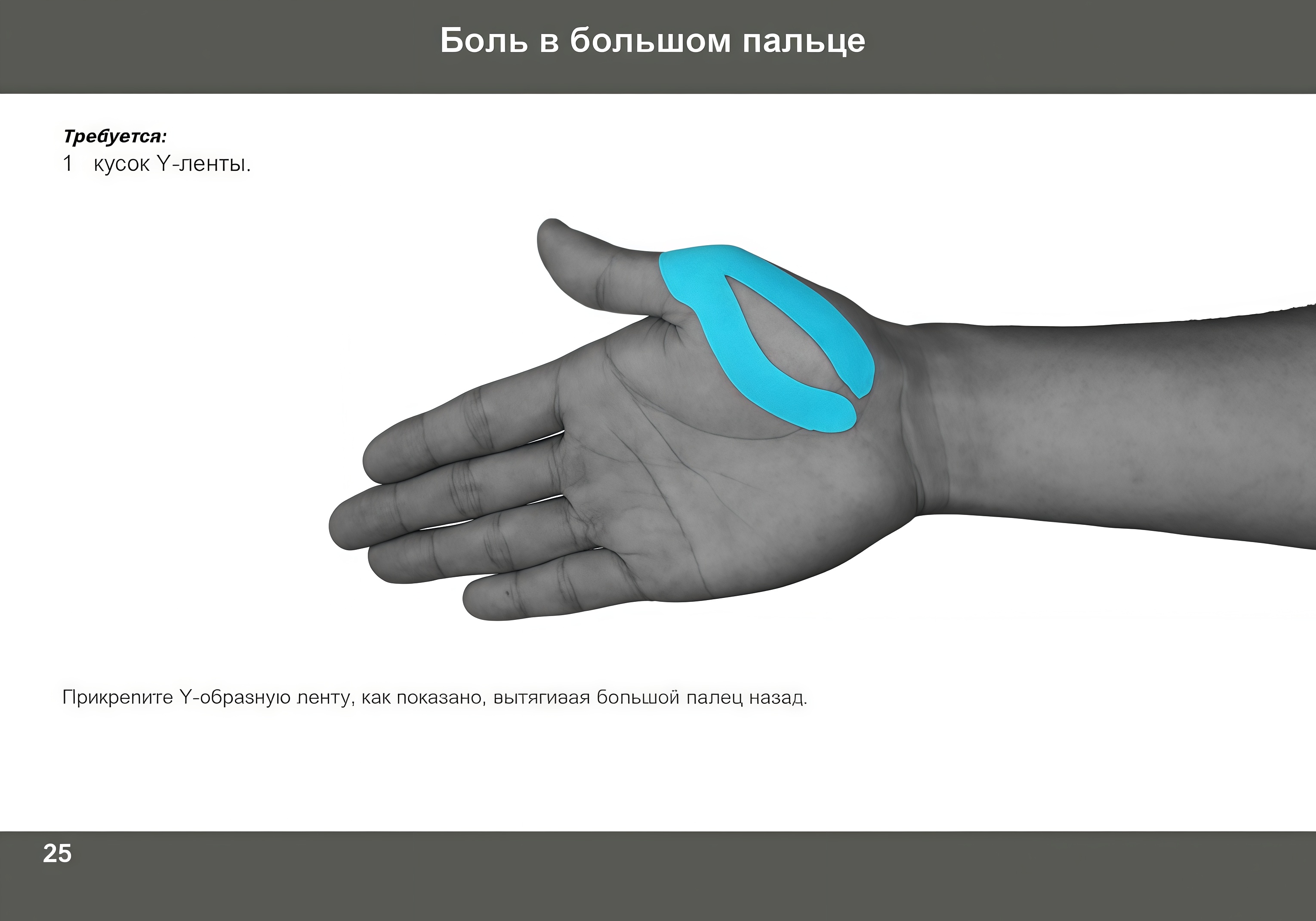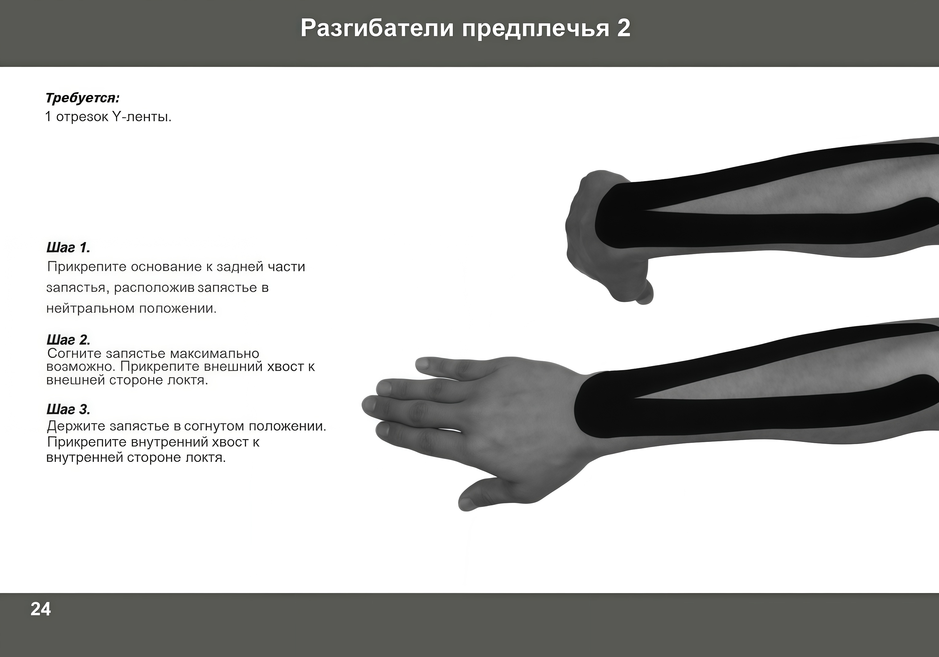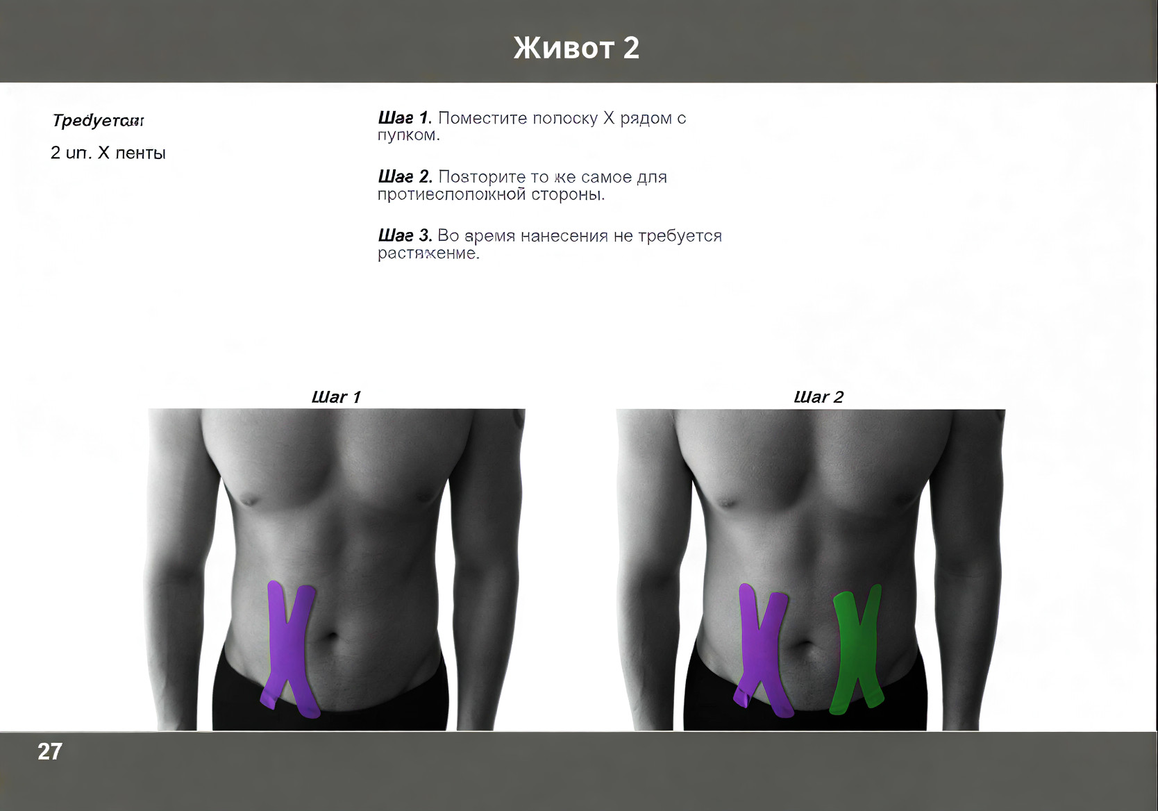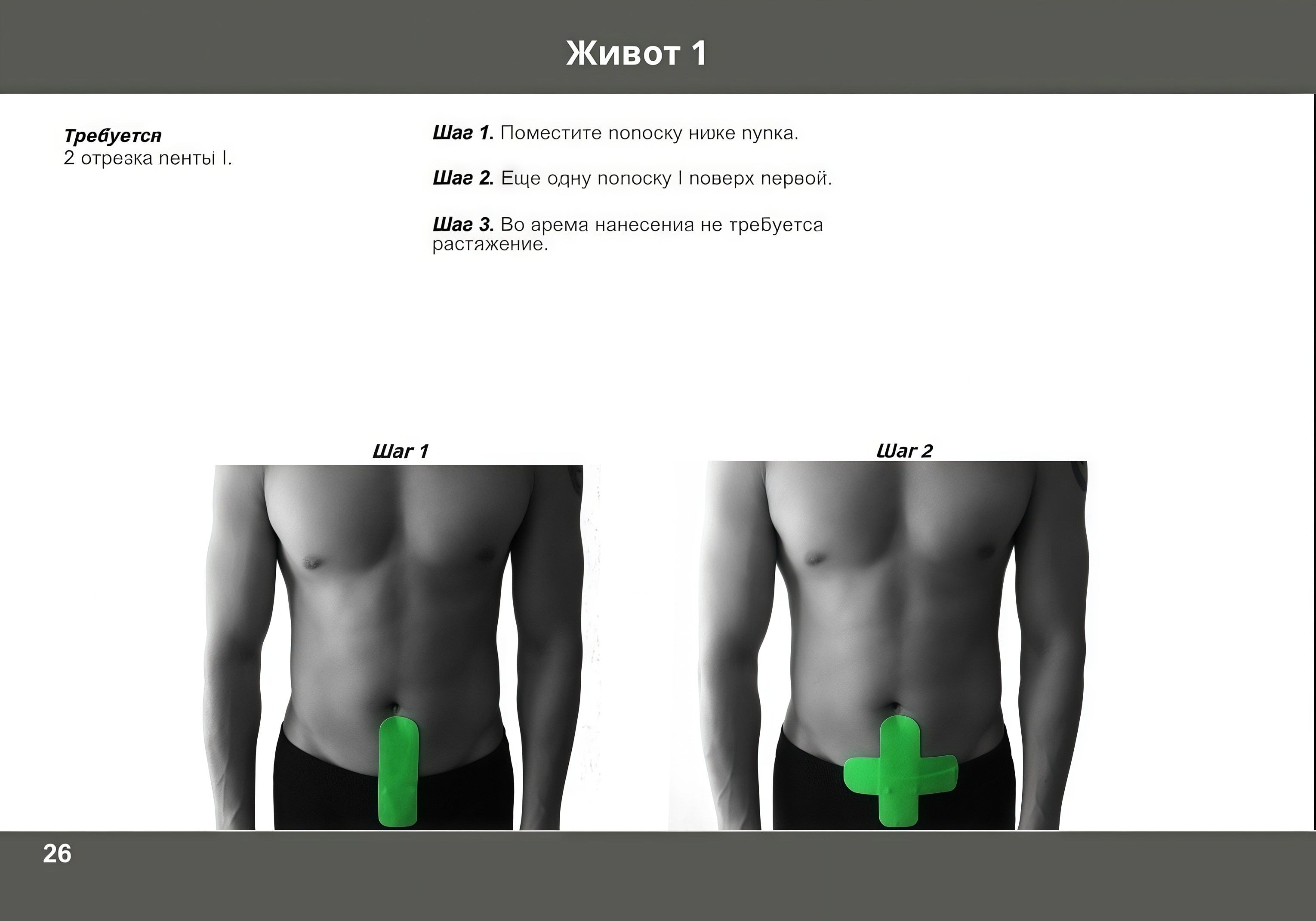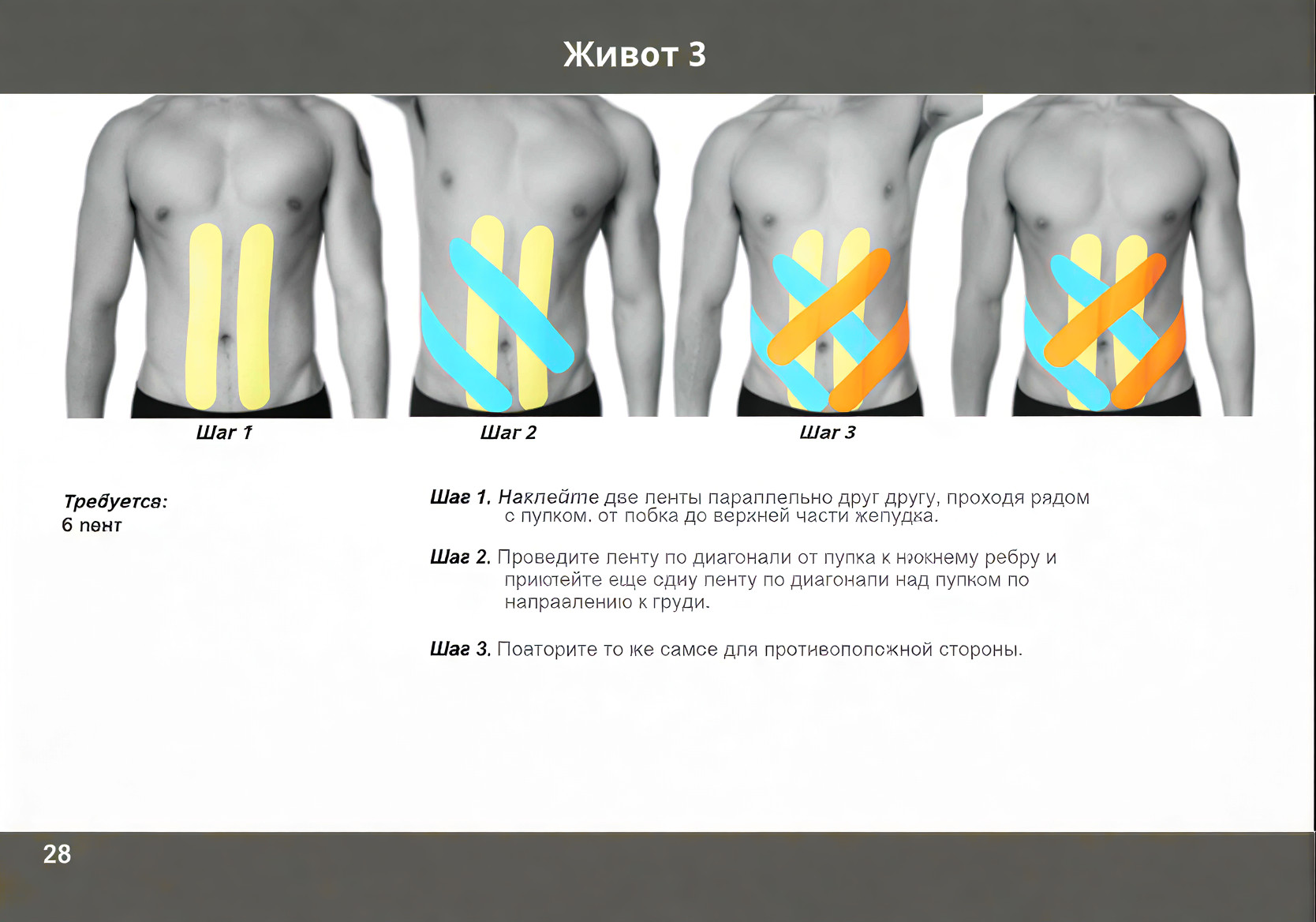 Ленты приклеивают послойно (одну на другую) так, чтобы пострадавшие связки и сухожилия были зафиксированы в физиологичном положении. Уровень растяжения ткани около 40%. Концы ленты хорошо фиксируют. Они не должны быть натянутыми.