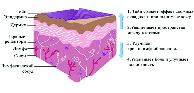 Тейпирование действует как активатор крово- и лимфотока. Также лента играет роль фиксатора для обеспечения физиологически правильного движения. Что такое кинезиологическое тейпирование с точки зрения механики? Это методика, позволяющая слегка приподнять кожу относительно мышц и связок, что создает дополнительное внутритканевое пространство. Из-за возникшего легкого натяжения при движении появляется легкий массажный эффект. Как следствие, в этом месте восстанавливается микроциркуляция крови и лимфы.