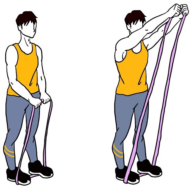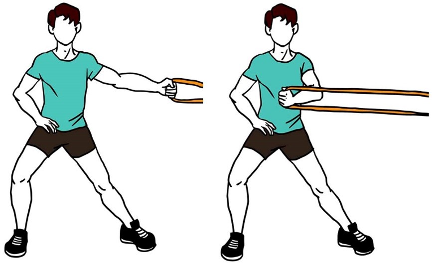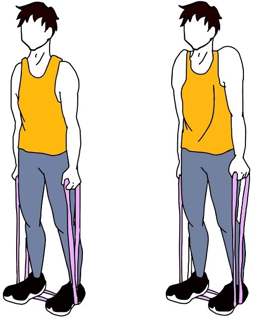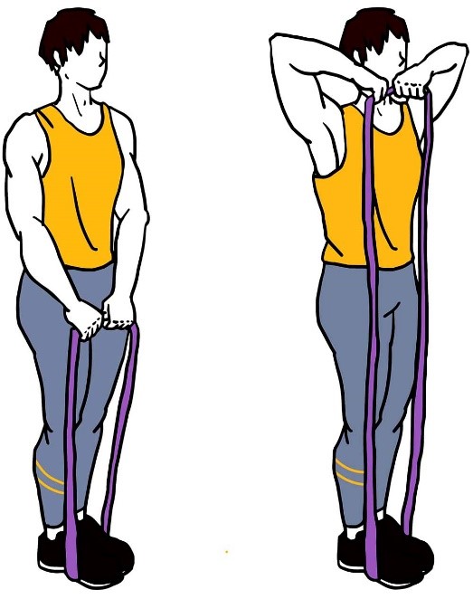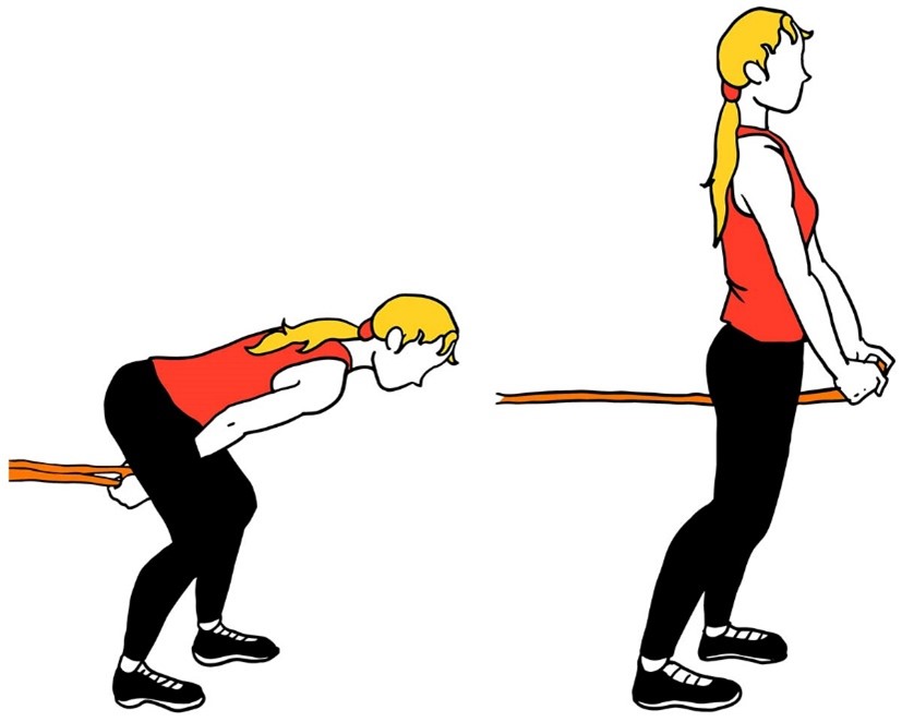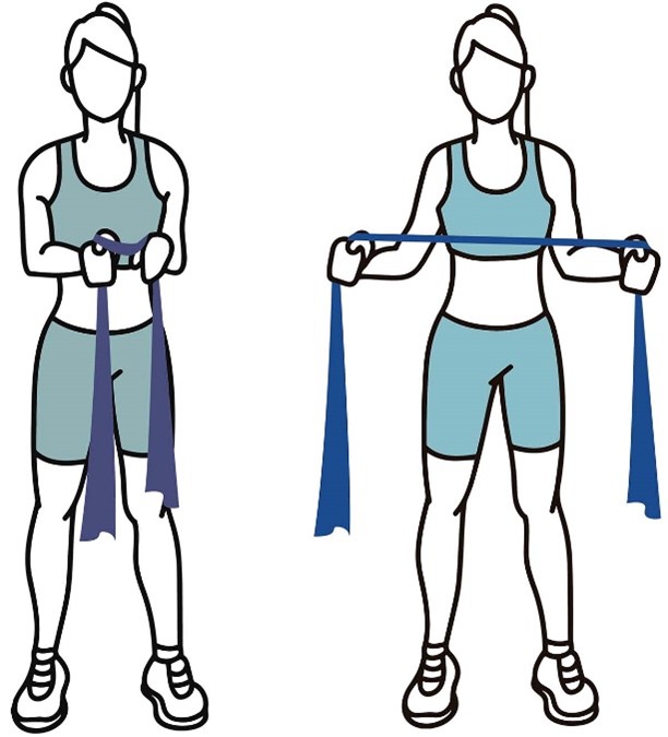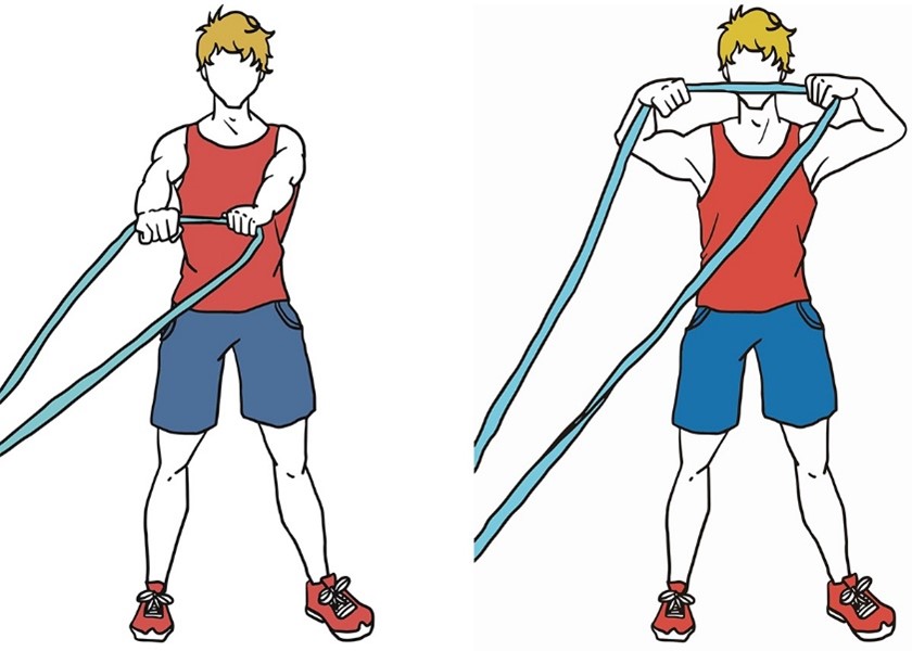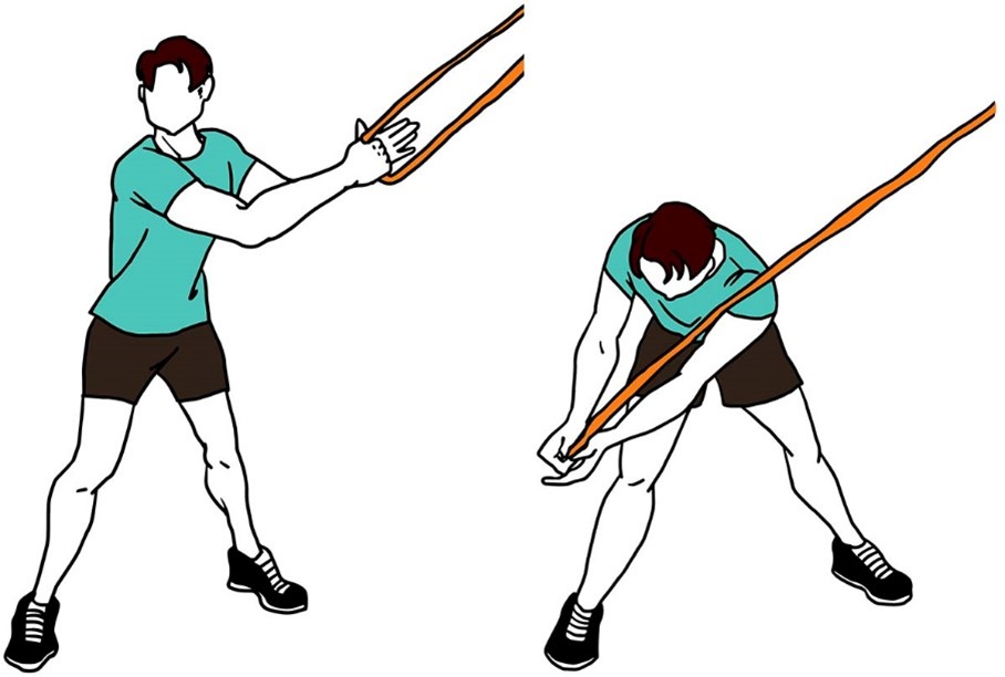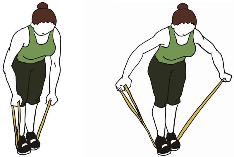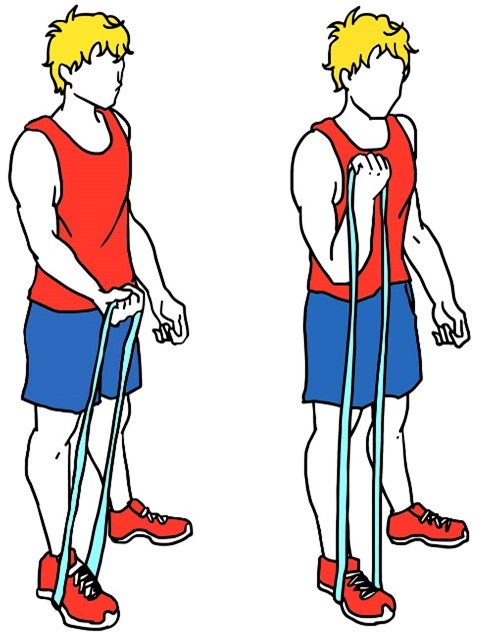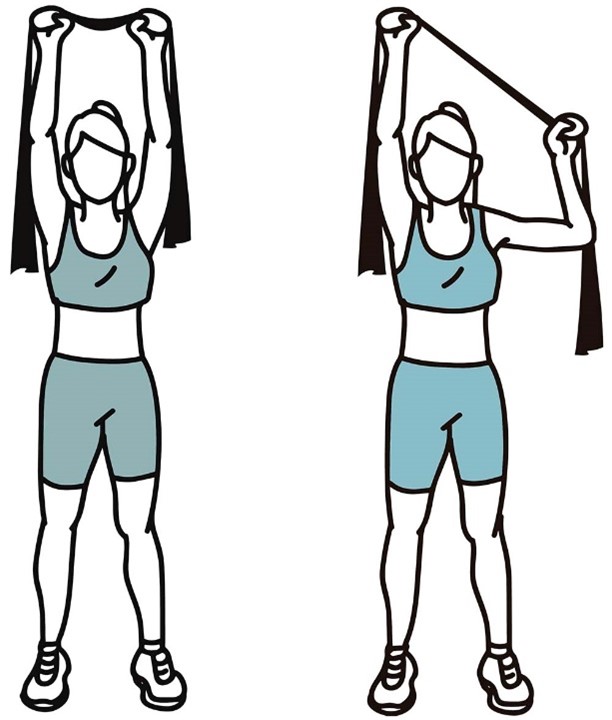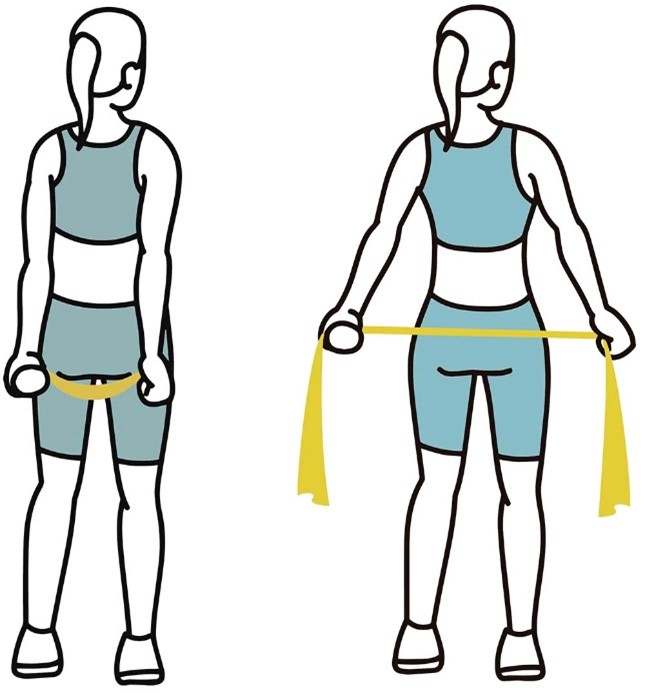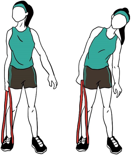 - Держите ленту сбоку согнув локоть, в положении стоя, как в исходном положении (показано на изображении).