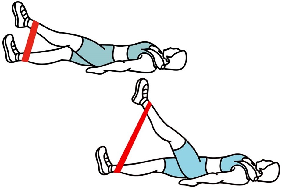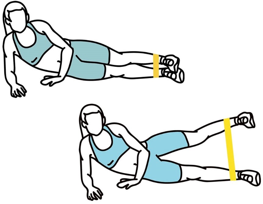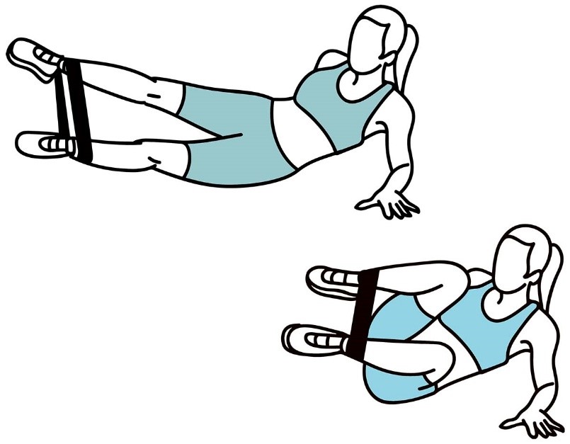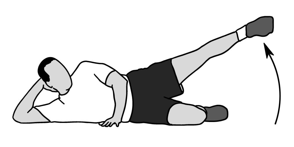 - Выпрямите верхнюю ногу и медленно поднимите ее до 45 °. Держите колено прямым.