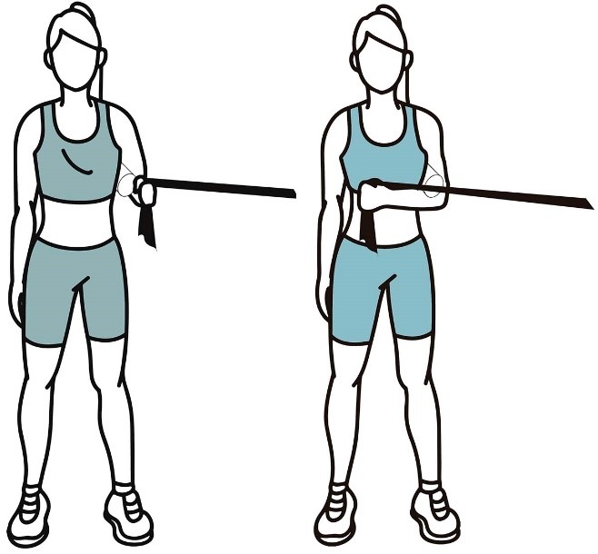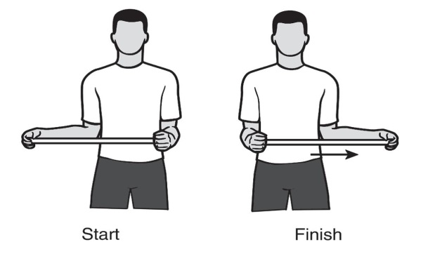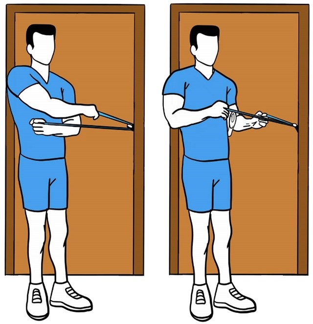 - Прижмите локоть к боку и медленно отводите кисть наружу.