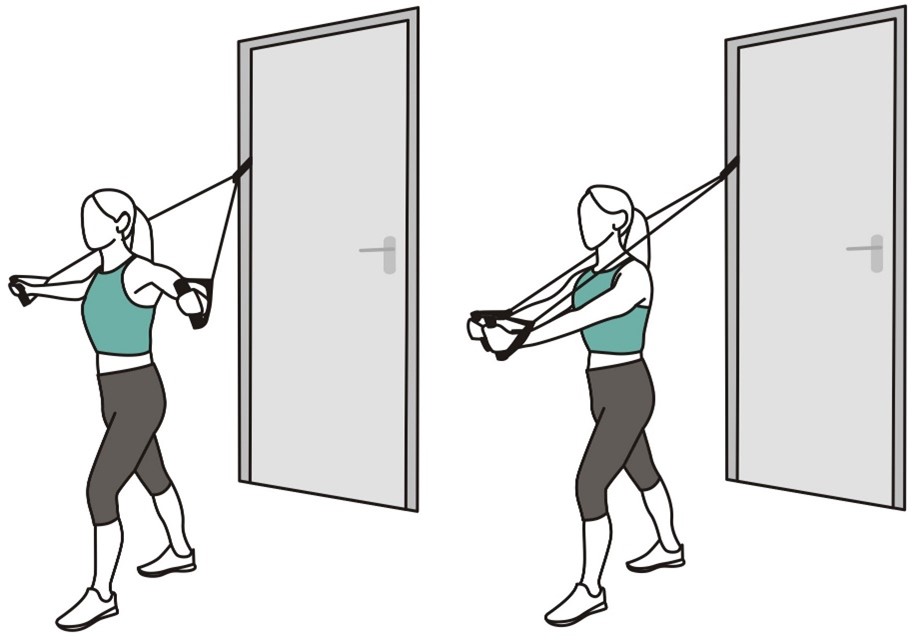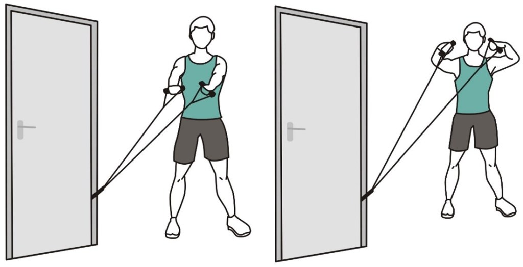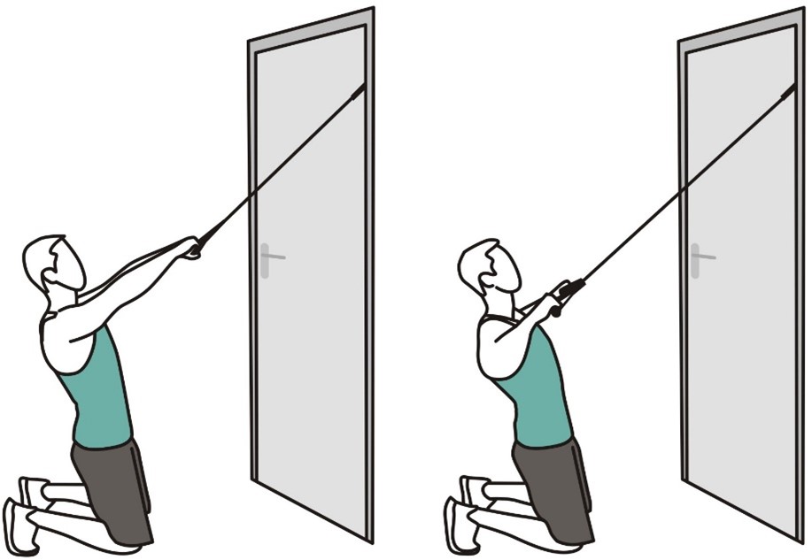 - Встаньте, согнув руку в локте под углом 90 градусов, поднимите ее до уровня плеча, как в исходном положении (показано на изображении).