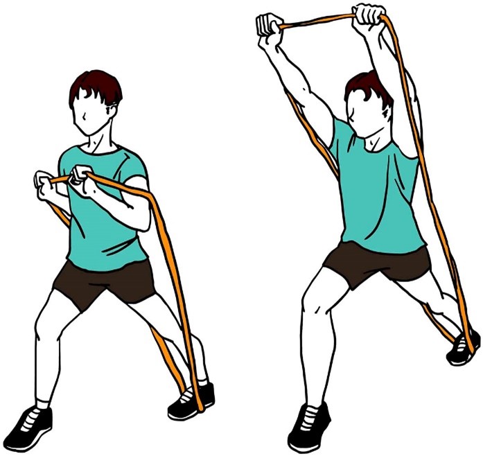 - В положении стоя держите ленту сбоку согнув локоть, аналогично исходному положению на изображении.