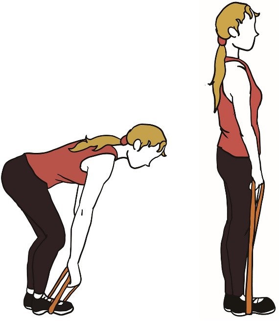 - Одной рукой держите палку за спиной. Другой рукой слегка возьмитесь за другой конец палки.