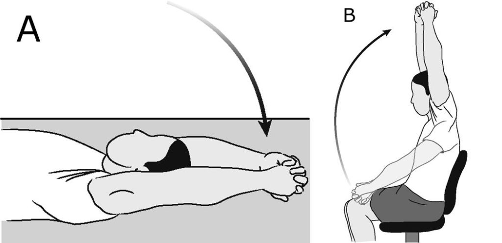 - Поднимите руку вверх так, чтобы пальцы указали на потолок и задержитесь на 10 секунд. Рука не должна сгибаться в локте.