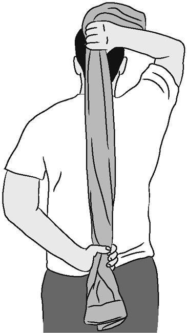 - Для выполнения упражнения потребуется полотенце или вы можете помочь себе другой рукой, чтобы отвести руку за спину с другой стороны.