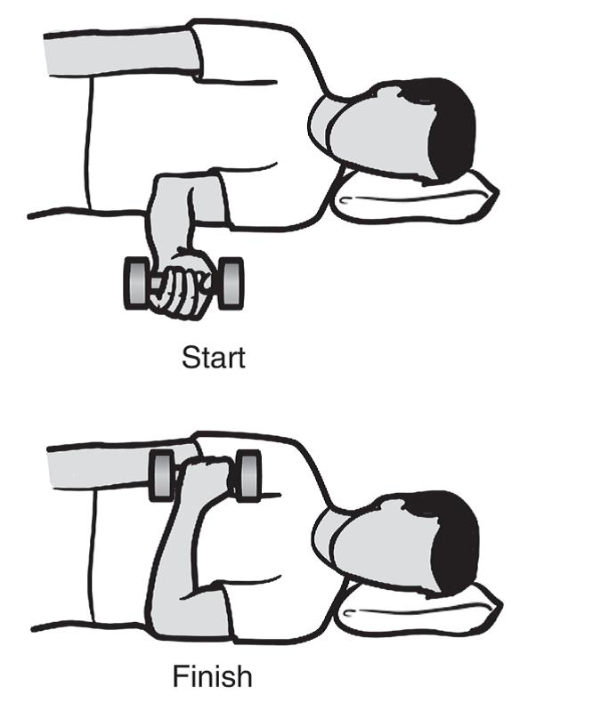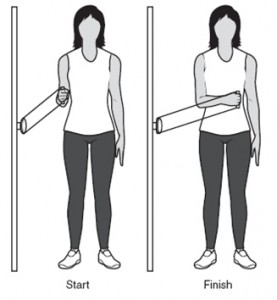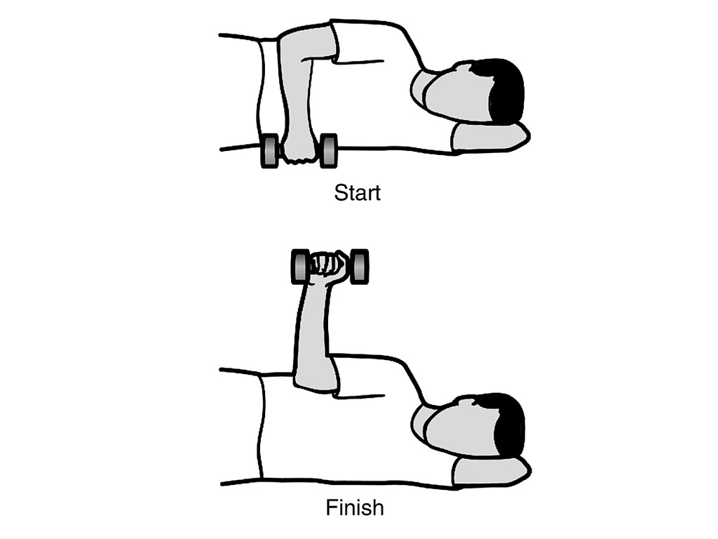 - Держите локоть близко к боку, постепенно сгибая локтевой сустав, как показано на рисунке.