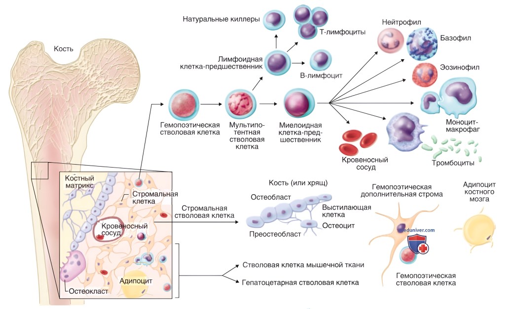 Мезенхимальные клетки — это один из видов стволовых клеток, которые являются предшественниками клеток костной, хрящевой и жировой тканей. В области введения они способны восстанавливать утраченные ткани и их полноценную функцию. Тромбоциты и факторы роста в составе BMAC-препарата дополнительно ускоряют заживление тканей, способствуют образованию новых сосудов, а также уменьшают воспалительные процессы.