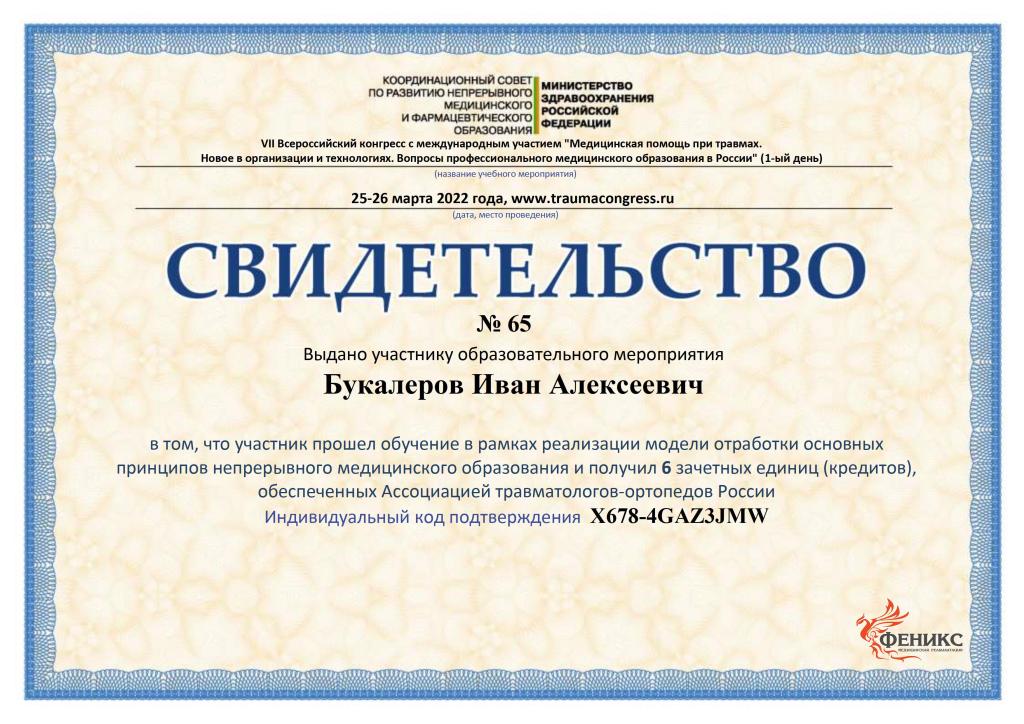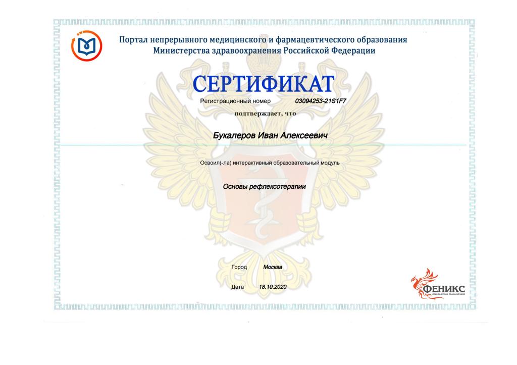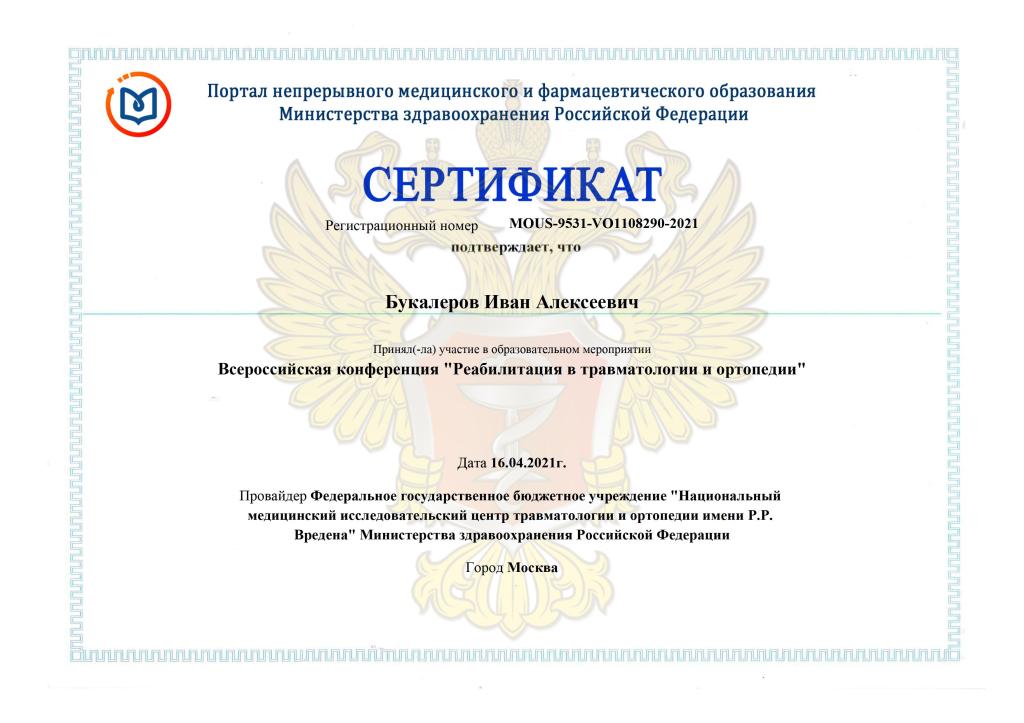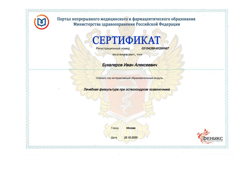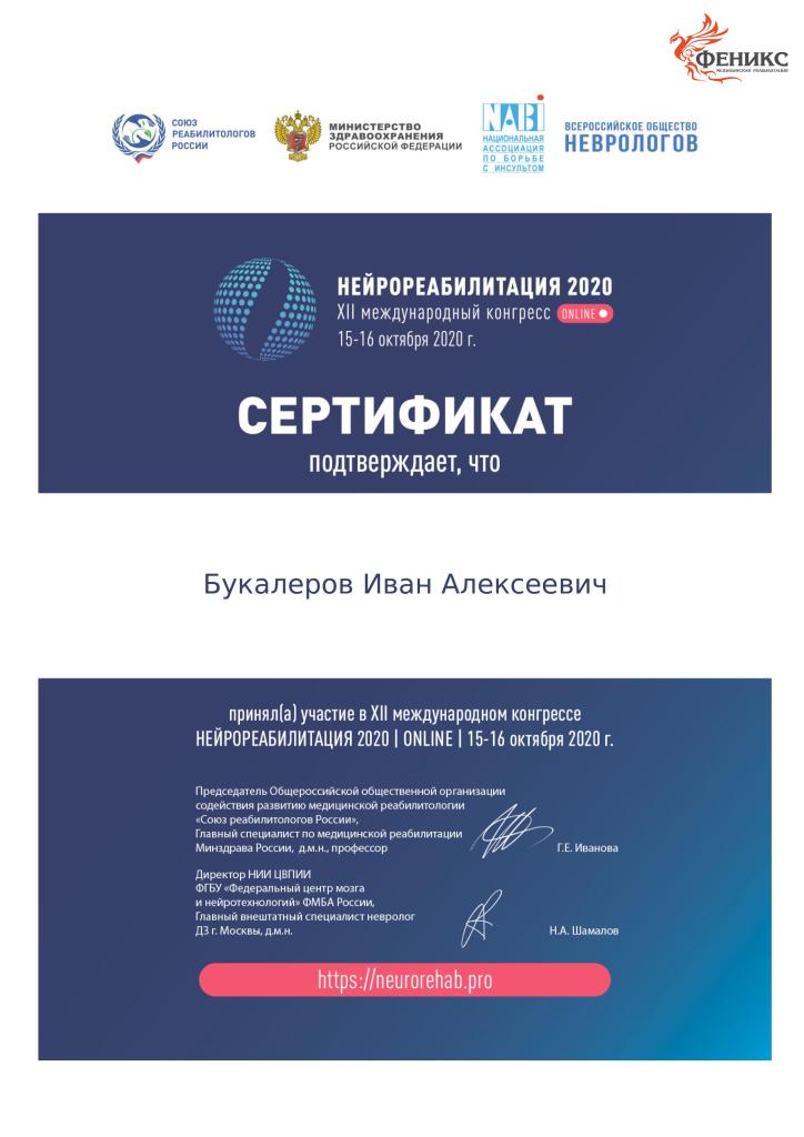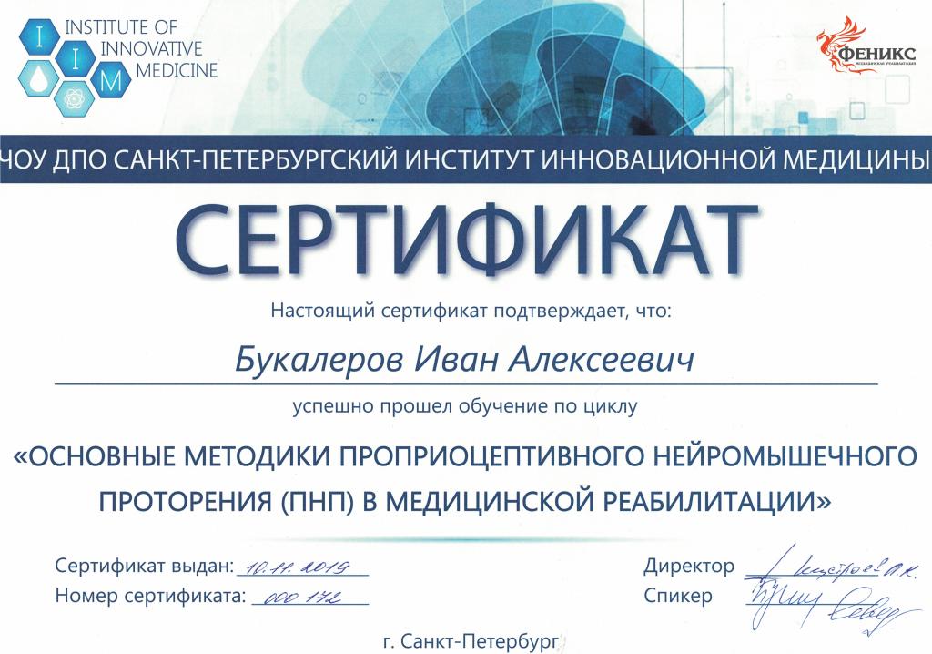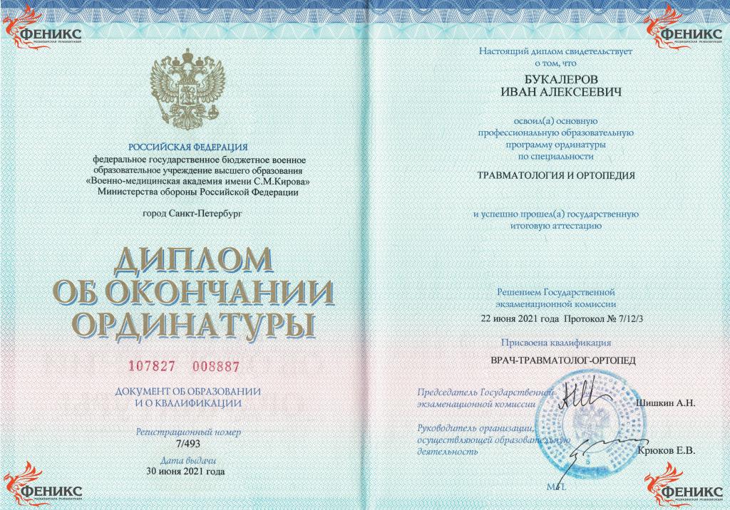 Букалеров Иван Алексеевич, окончил федеральное государственное бюджетное военное учреждение «Военно-медицинскую академию имени С. М. Кирова» факультет подготовки врачей для ракетных и сухопутных войск. Обучался в клинической ординатуре по специальности «Травматология и ортопедия» на кафедре военной травматологии и ортопедии Военно-медицинской академии имени С. М. Кирова, после чего прошел профессиональную переподготовку по специальностям «Лечебная физкультура и спортивная медицина», «Мануальная терапия», «Физическая и реабилитационная медицина». Закончил сертификационный цикл по проприоцептивной нейромышечной фасилитации, методике нейромышечной активации с использованием подвесных терапевтических систем Redkord, методике экзореабилитации с применением медицинского роботизированного комплекса ExoAtlet I для пациентов различных нозологий с нарушением локомоторных функций. Являюсь членом ассоциации «Лига подиатрии». Активно занимаюсь научной деятельностью, являюсь соавтором методических рекомендаций по применению медицинского экзоскелета «Экзоатлет» у пациентов с патологией опорно-двигательного аппарата и нервной системы в военно-медицинских организациях Министерства обороны Российской Федерации.