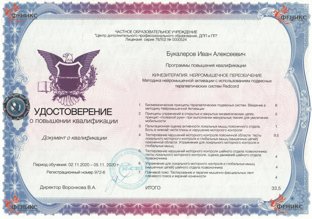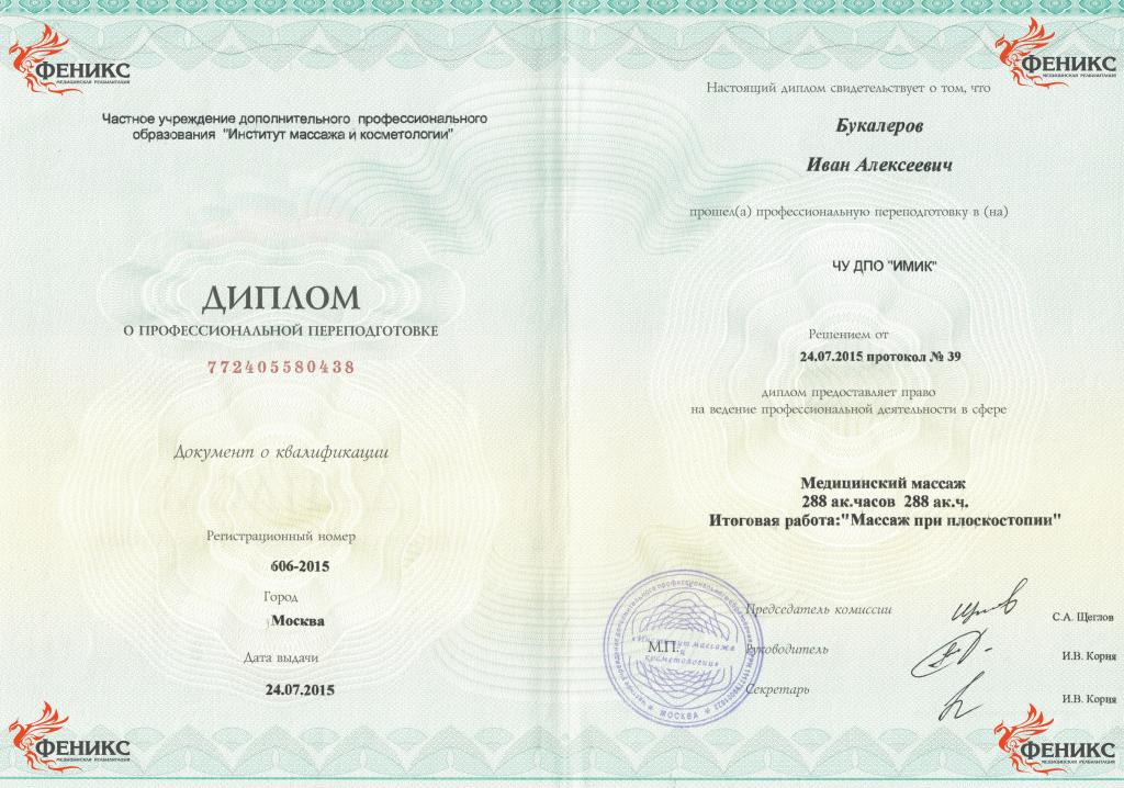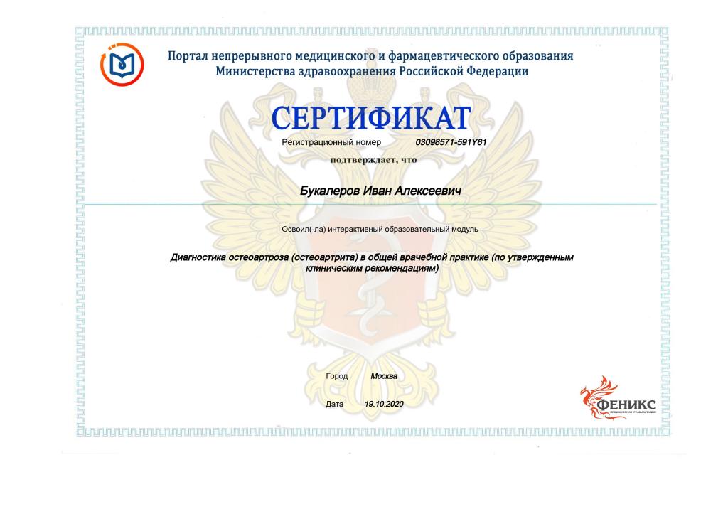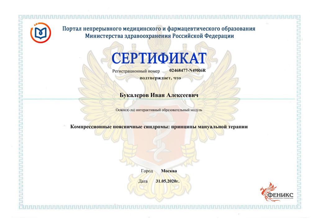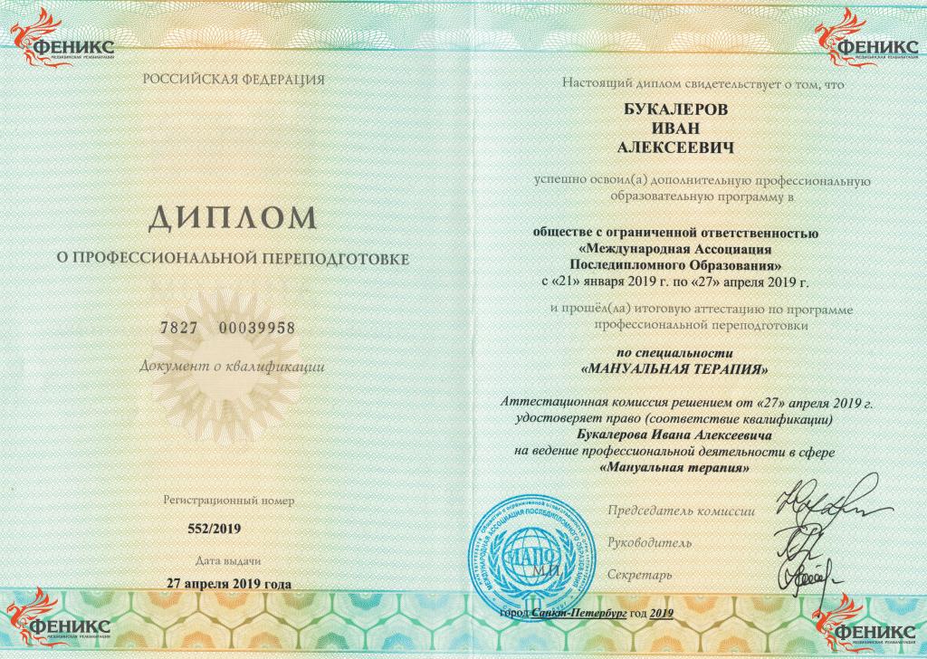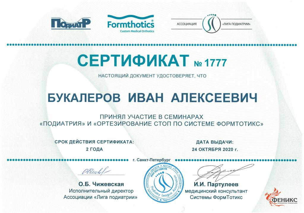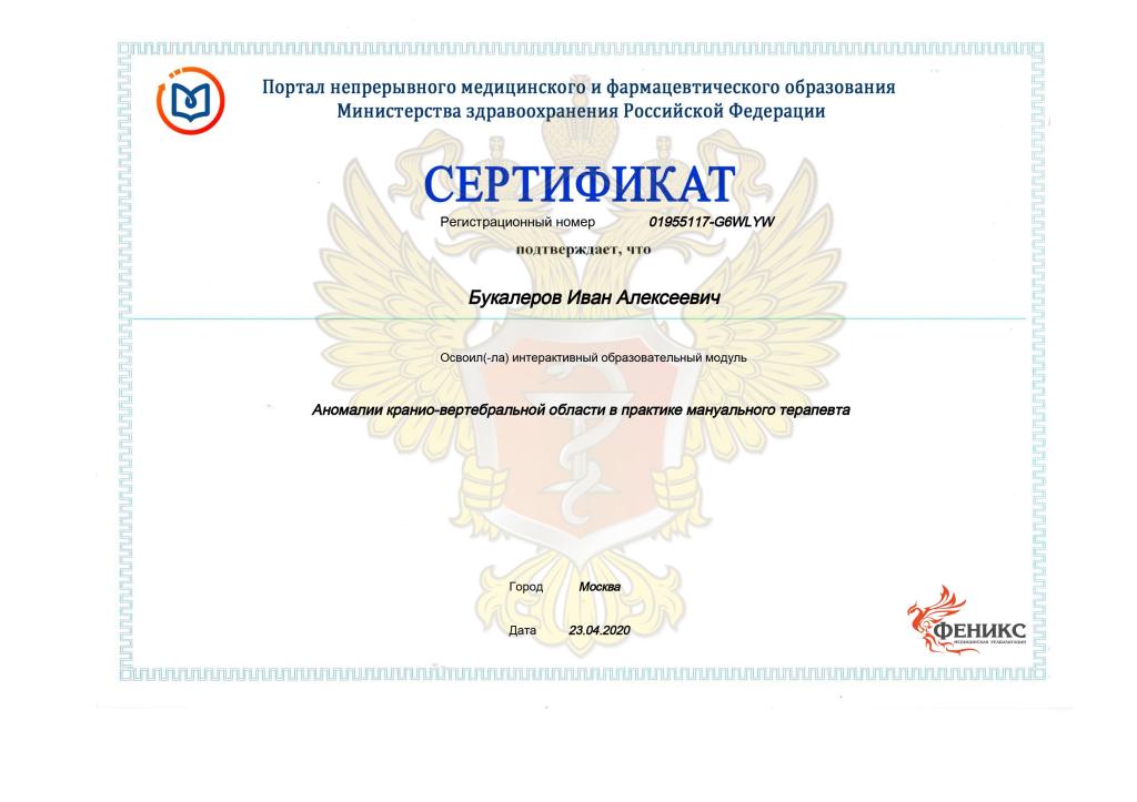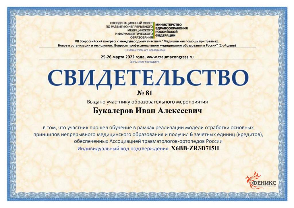 Букалеров Иван Алексеевич, окончил федеральное государственное бюджетное военное учреждение «Военно-медицинскую академию имени С. М. Кирова» факультет подготовки врачей для ракетных и сухопутных войск. Обучался в клинической ординатуре по специальности «Травматология и ортопедия» на кафедре военной травматологии и ортопедии Военно-медицинской академии имени С. М. Кирова, после чего прошел профессиональную переподготовку по специальностям «Лечебная физкультура и спортивная медицина», «Мануальная терапия», «Физическая и реабилитационная медицина». Закончил сертификационный цикл по проприоцептивной нейромышечной фасилитации, методике нейромышечной активации с использованием подвесных терапевтических систем Redkord, методике экзореабилитации с применением медицинского роботизированного комплекса ExoAtlet I для пациентов различных нозологий с нарушением локомоторных функций. Являюсь членом ассоциации «Лига подиатрии». Активно занимаюсь научной деятельностью, являюсь соавтором методических рекомендаций по применению медицинского экзоскелета «Экзоатлет» у пациентов с патологией опорно-двигательного аппарата и нервной системы в военно-медицинских организациях Министерства обороны Российской Федерации.