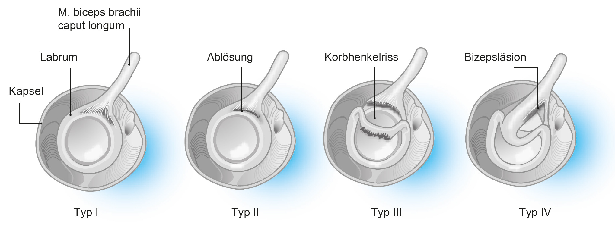В зависимости от степени и направления разрыва различают четыре основных типа SLAP-повреждений (по Snyder):